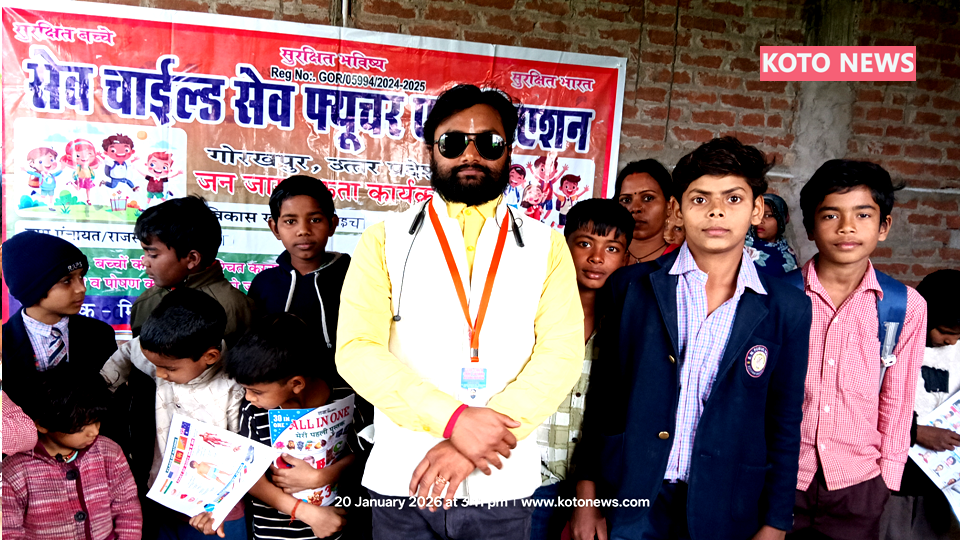 भारत ,20 जनवरी 2026 | जनपद गोरखपुर के पिपराइच विकासखंड अंतर्गत ग्राम सारंडा में दिनांक 20 जनवरी 2026 को सेव चाइल्ड सेवा फ्यूचर एसोसिएशन के तत्वाधान में एक भव्य जन-जागरूकता कार्यक्रम का आयोजन किया गया। इस कार्यक्रम का उद्देश्य ग्रामीण क्षेत्र में बच्चों के अधिकारों, शिक्षा, बाल सुरक्षा, जल वायु परिवर्तन तथा सामाजिक कुरीतियों के प्रति लोगों को जागरूक करना रहा। कार्यक्रम में संस्था के पदाधिकारियों के साथ-साथ बड़ी संख्या में ग्रामीण महिलाएं, पुरुष और बच्चे शामिल हुए। कार्यक्रम की अगुवाई सेव चाइल्ड सेवा फ्यूचर एसोसिएशन के पदाधिकारी मिथुन निषाद एवं रितेश प्रजापति ने की। दोनों पदाधिकारियों ने ग्रामीणों को संबोधित करते हुए कहा कि बच्चों का सुरक्षित और शिक्षित भविष्य ही समाज और देश की मजबूत नींव है। उन्होंने कहा कि जब तक समाज का अंतिम व्यक्ति जागरूक नहीं होगा, तब तक वास्तविक विकास संभव नहीं है।